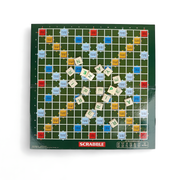 The classic design features the iconic Scrabble board with premium squares, familiar to generations of players. The dark green box highlights the game’s prestigious status as the ultimate word game.