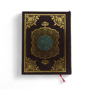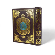This Al-Quran Al-Kareem - Deluxe Gold Embossed Edition is a beautifully crafted Quran featuring a luxurious leather-like brown cover with intricate gold embossing. The centerpiece showcases an ornate floral pattern with a turquoise circular medallion, adding a regal and sophisticated appearance to this sacred book. Designed for both beauty and durability, this edition is perfect for those who seek an elegant Quran for personal use, display, or as a meaningful gift.